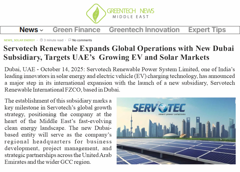 Servotech Renewable International FZCO is a premier clean-energy brand headquartered in Dubai, established to drive the next generation of sustainable infrastructure across the Middle East. As a strategic subsidiary of India based Servotech Renewable Power System Ltd., we bring over 21 years of pioneering experience in power electronics and renewable energy to the UAE. Our mission directly supports the UAE’s Net-Zero 2050 vision, bringing world-class engineering to the forefront of the Middle East’s green transition.