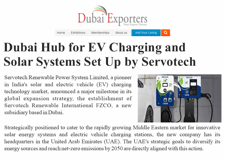 We deliver highly-efficient solar solutions and components, Electric vehicle charging systems stations, systems, spare parts, management, and operations. With Dubai’s premier logistics and regulatory environment, we are delivering cutting-edge renewable infrastructure for the region’s most ambitious projects. Servotech Renewable is committed to powering the global clean energy revolution through reliable technology, strategic partnerships, and relentless innovation tailored for the international market